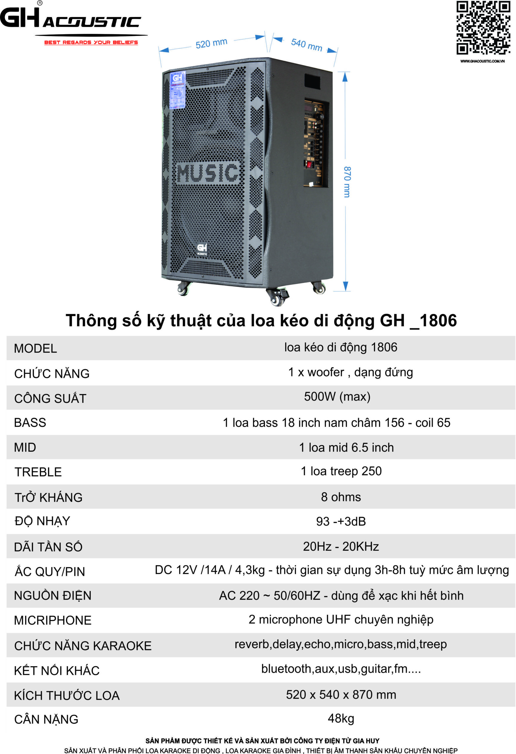 1806 có kích thước khá ấn tượng với chiều dài 54 cm, rộng 52cm và cao 87cm. Với trọng lượng 48 kg, sản phẩm có thể di chuyển một cách dễ dàng nhờ hệ thống bánh xe và tay cầm tiện dụng. Kiểu dáng của loa không chỉ hiện đại mà còn rất chắc chắn. Loa kéo 1806 không chỉ phù hợp cho ngoài trời mà còn có thể sử dụng tại các sự kiện quy mô lớn nhờ vào khả năng khuếch đại âm thanh mạnh mẽ.